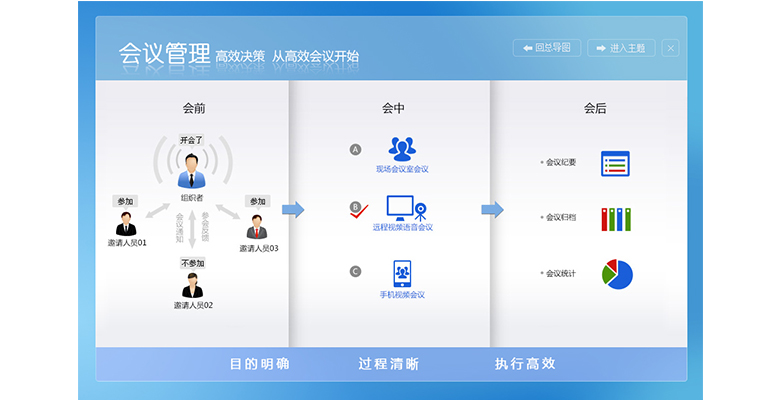 用于會議通知、會議資料的發(fā)出、會議室的查看,到時提醒,對參會情況的事先了解,會議紀(jì)要的總結(jié)和歸檔等。