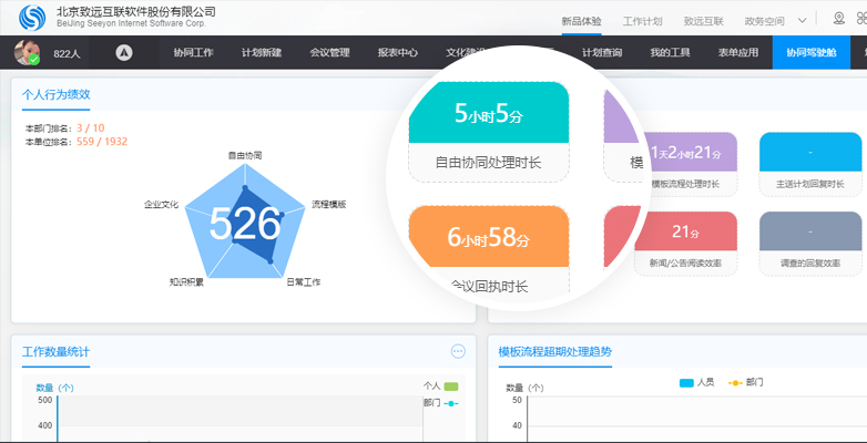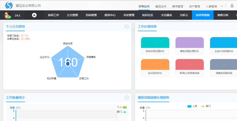 圖表化呈現(xiàn)不同維度辦公效率信息,如個人行為績效、工作處理效率等。