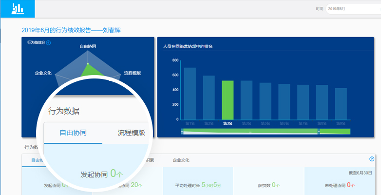 支持個人行為績效、組織行為績效的圖表化呈現(xiàn),員工及管理者可多維度查看辦公效率,并實時優(yōu)化改進。