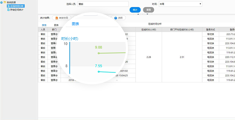 系統(tǒng)管理員可查看協(xié)同系統(tǒng)的使用情況,如在線人數(shù)趨勢等。組織中的人員還可查看自己與其他人之間的工作關(guān)系指數(shù)。