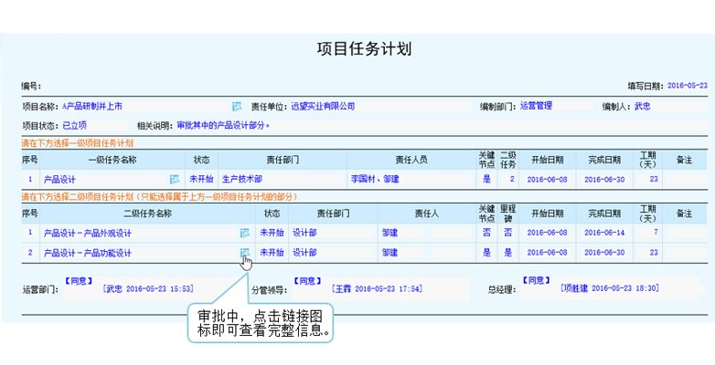 項目立項審批完成后,相關(guān)的項目信息自動保存,之后相關(guān)部門(如運營管理部門)即可編制項目任務(wù)的相關(guān)計劃了。