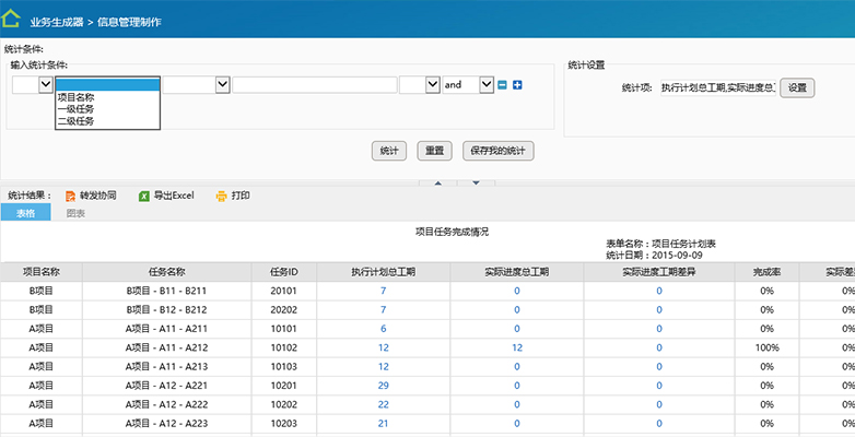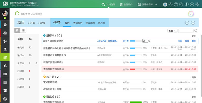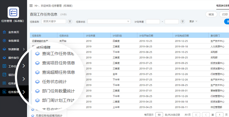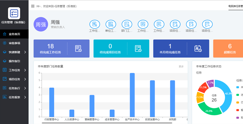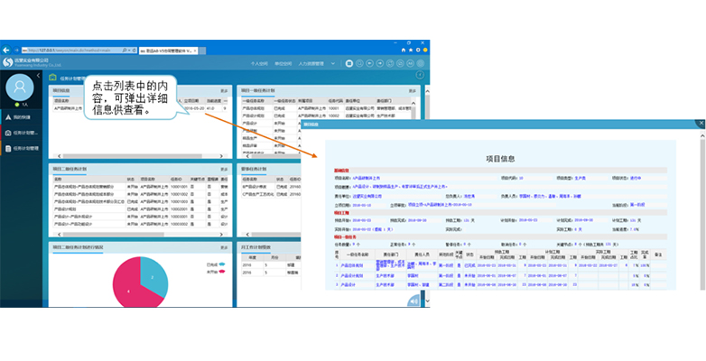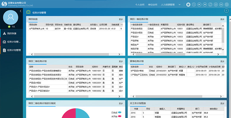 在任務(wù)計劃管理的空間中,相關(guān)的管理信息數(shù)據(jù)、統(tǒng)計圖表在一個頁面中展現(xiàn),管理者可方便地隨時查看相關(guān)內(nèi)容。
