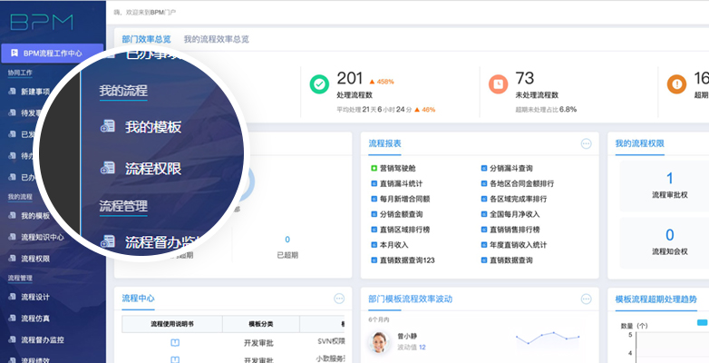 可通過流程模版查看流程效率,亦可通過部門人員查看流程效率。為優(yōu)化流程提供依據(jù)。