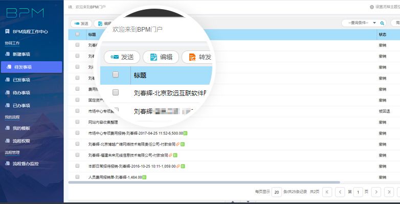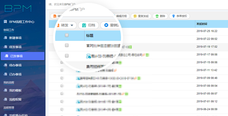已發(fā)事項留痕,便于回查??蓪σ寻l(fā)事項進行轉(zhuǎn)發(fā)、歸檔、撤銷流程、編輯流程、重復(fù)發(fā)起、刪除、表單授權(quán)。