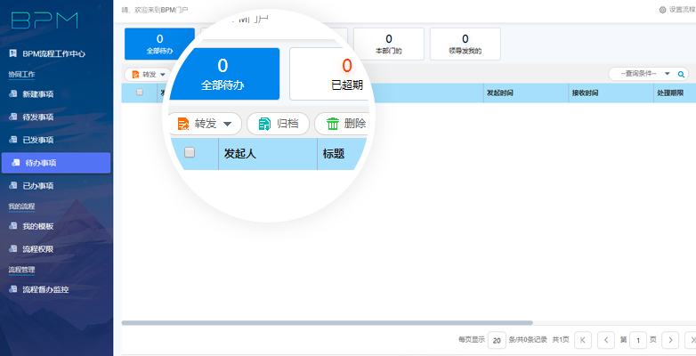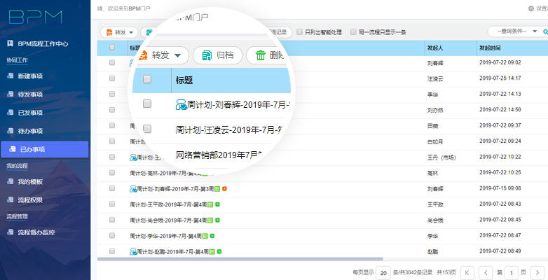 接收關(guān)聯(lián)事項,可對待辦事項進行轉(zhuǎn)發(fā)、歸檔、刪除、批量處理、排序。
