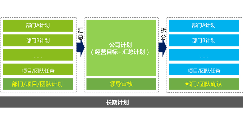 支持對戰(zhàn)略規(guī)劃的分解執(zhí)行。戰(zhàn)略規(guī)劃在時間緯度、組織緯度、目標(biāo)內(nèi)容緯度形成了三維模型。