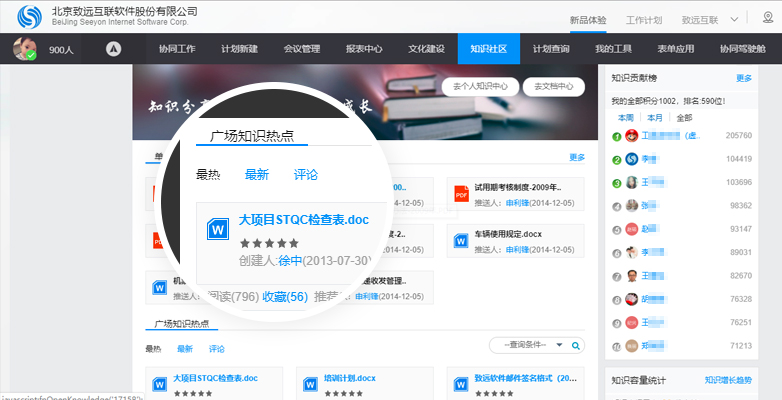 在知識廣場可查看單位學(xué)習(xí)區(qū)、廣場知識熱點、知識貢獻榜、知識容量統(tǒng)計。
