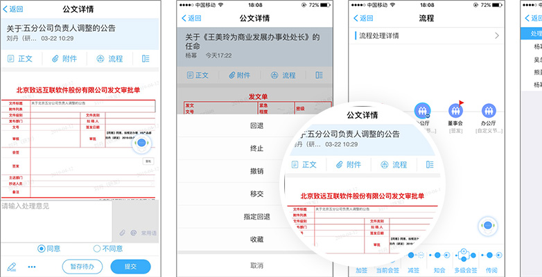 支持移動端辦文、對流程的操作,以及公文詳情的處理。