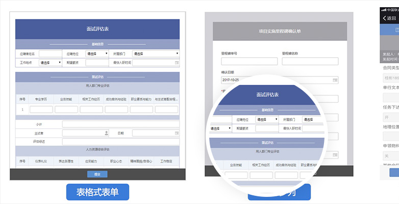 支持流水號、明細(xì)表、選人、選部門等組織機構(gòu)控件,支持PC端 原樣表單和移動端瀑布流表單的原生展現(xiàn)方式。