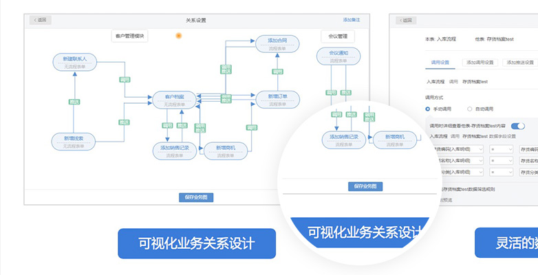 高度抽象的數(shù)據(jù)流轉(zhuǎn)關(guān)系設(shè)計,創(chuàng)造性的可視化展現(xiàn)形式,業(yè)務(wù)數(shù)據(jù)間的復(fù)雜關(guān)系僅需通過“調(diào)用”、“推送”配置,即可滿足業(yè)務(wù)表間數(shù)據(jù)聯(lián)動、業(yè)務(wù)流轉(zhuǎn)。